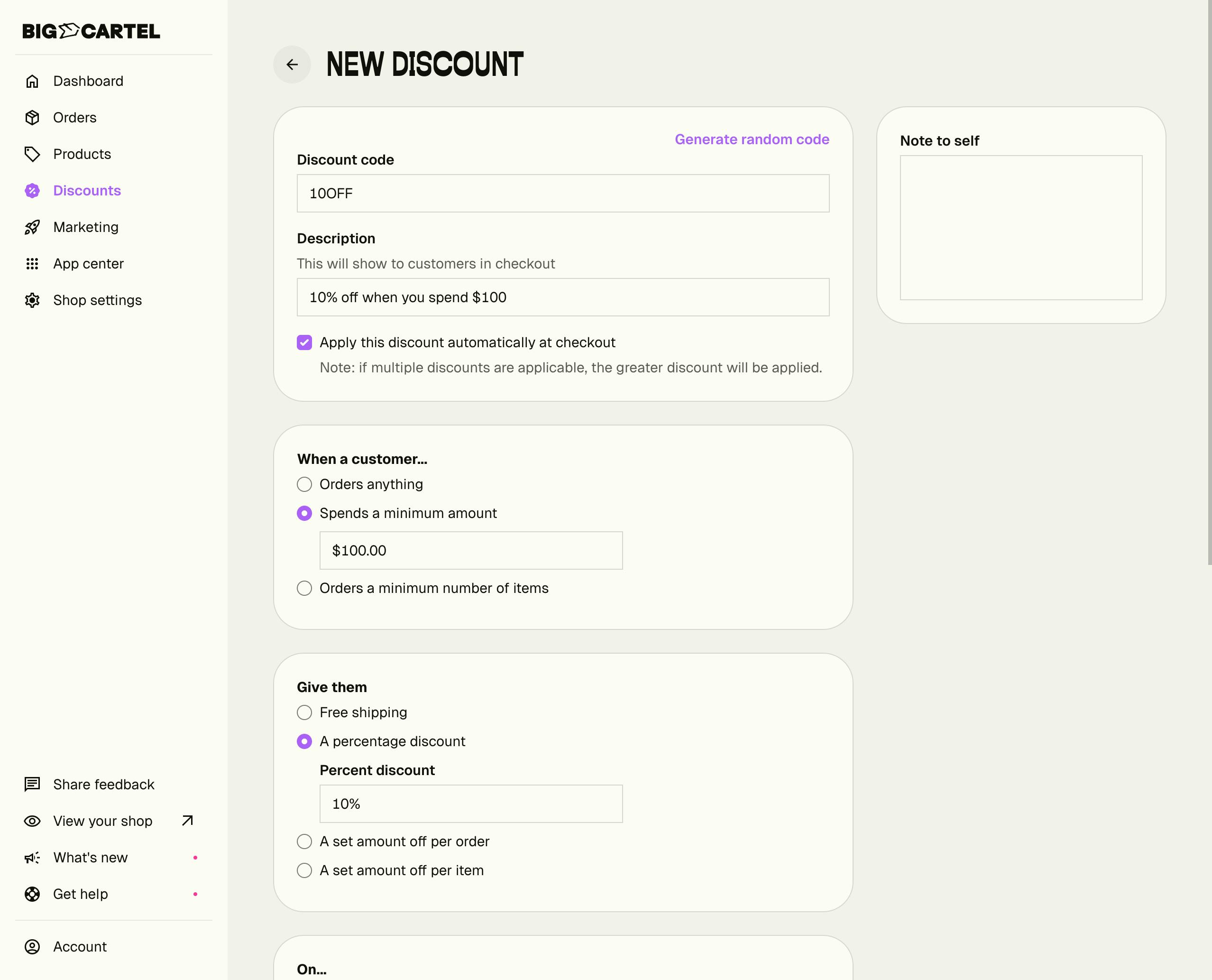 You can also check Apply this discount automatically at checkout if you want it to apply without the customer needing to enter a code (Diamond plan users only).