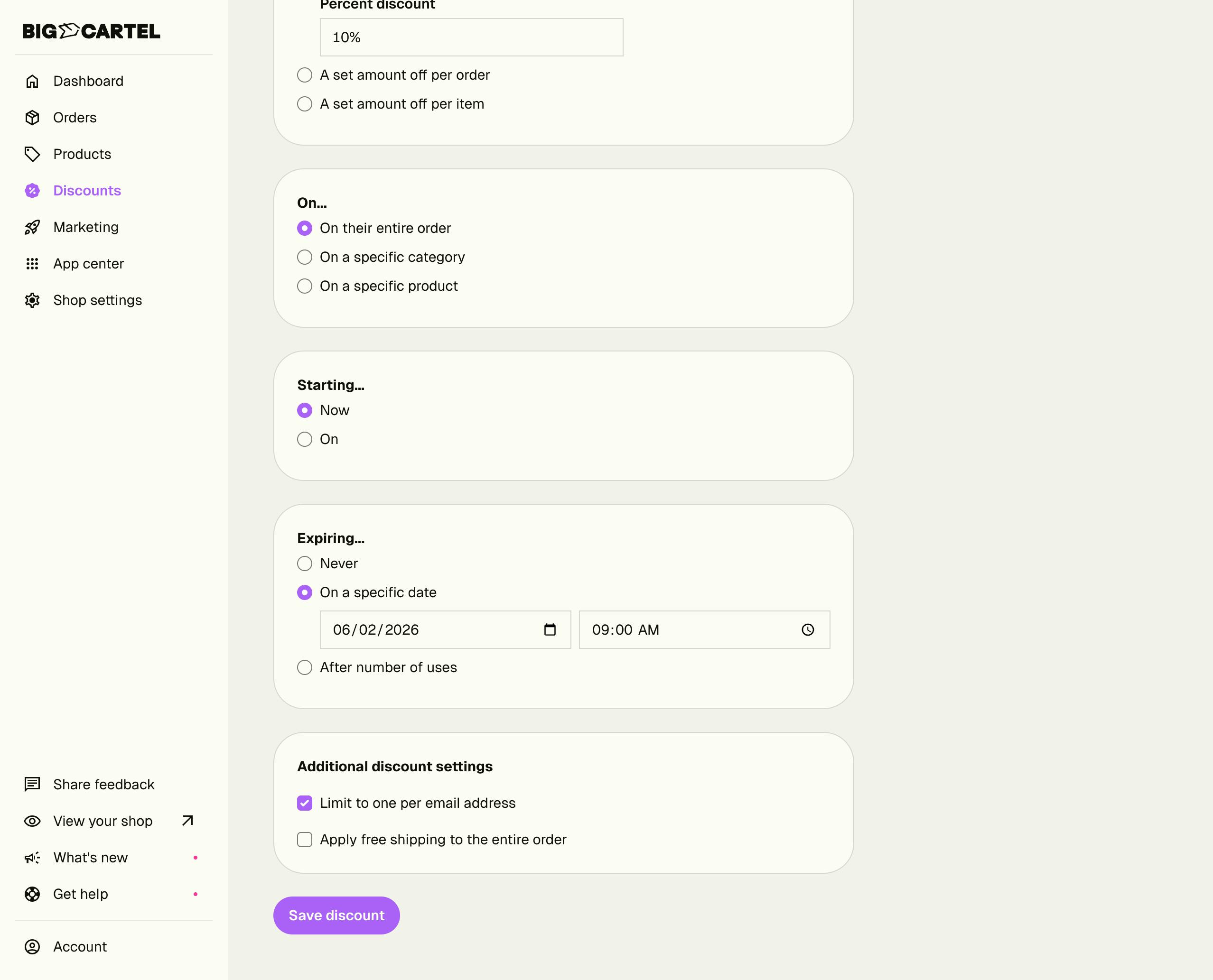 Once you're happy with your settings, click Save discount at the bottom.