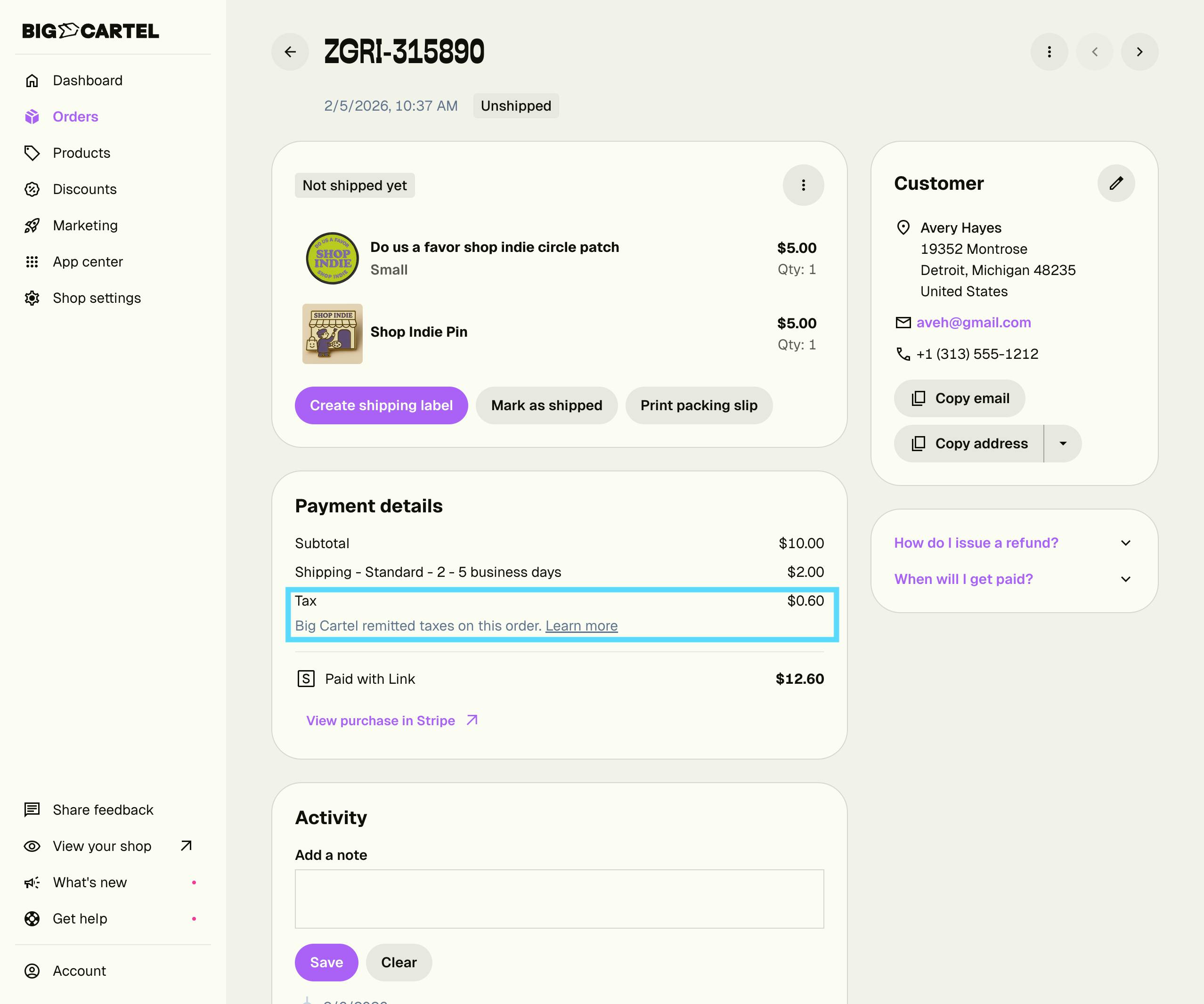 You can see how much tax was collected in the order’s details. All this info is also listed in the CSV file you can download from the Unshipped and Shipped sections of your Orders page.