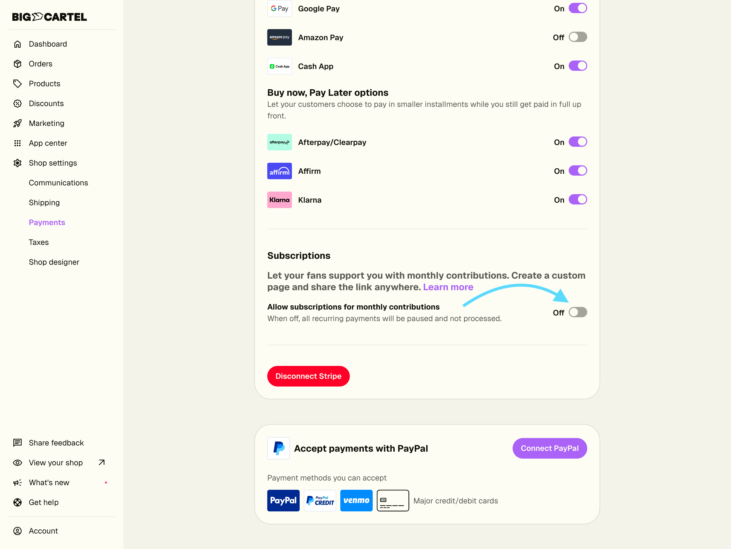 To turn on subscriptions, your shop needs to be on a paid plan, and you need to have the Stripe checkout connected as well. When you’re ready to start accepting subscriptions, head to Shop settings > Payments, then scroll down to the Subscriptions section and use the toggle switch to enable your subscription option.