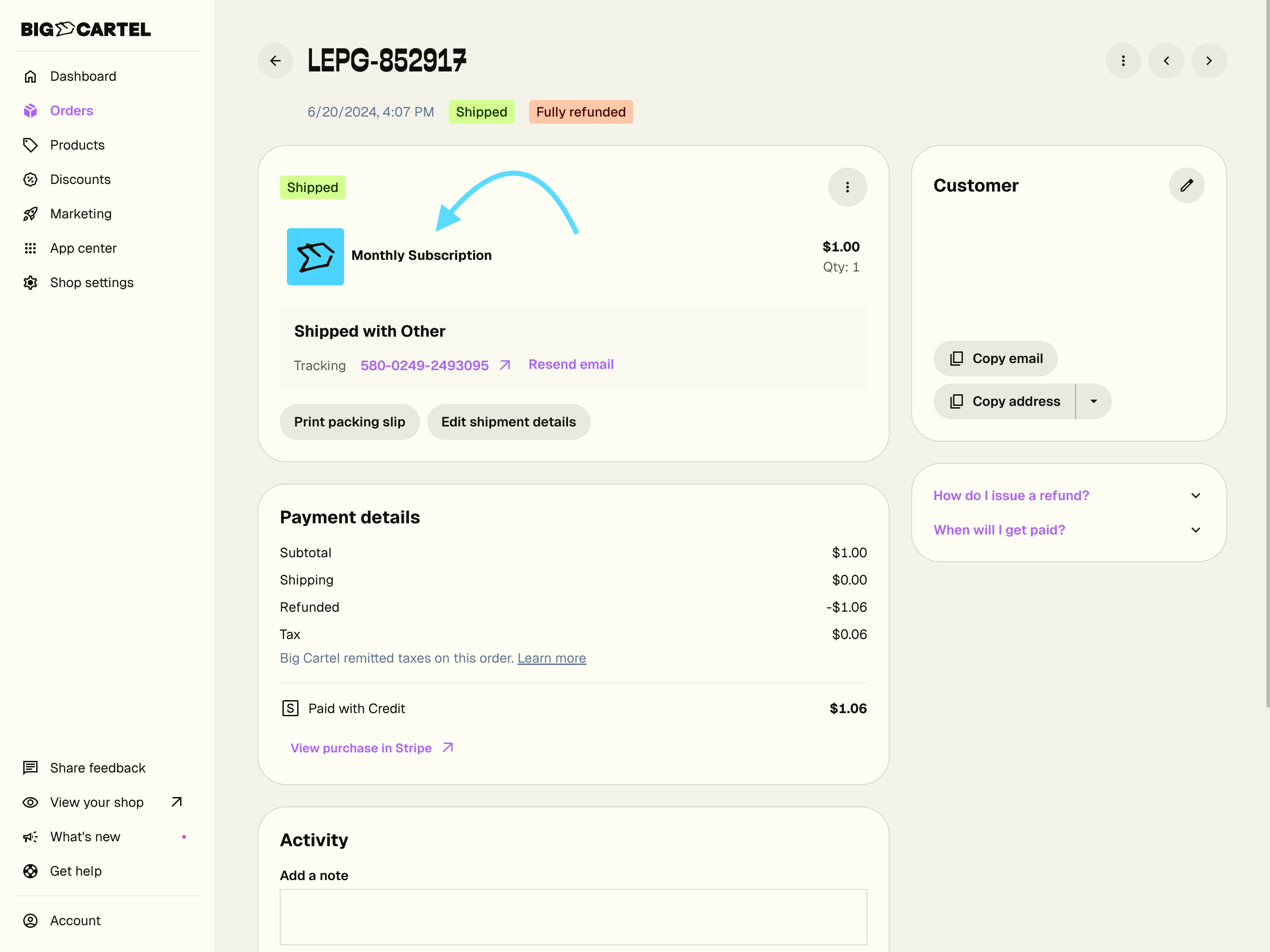 Your donations can be viewed in your Stripe dashboard and in your Big Cartel admin, they'll automatically be added to the Shipped list in the Orders section.